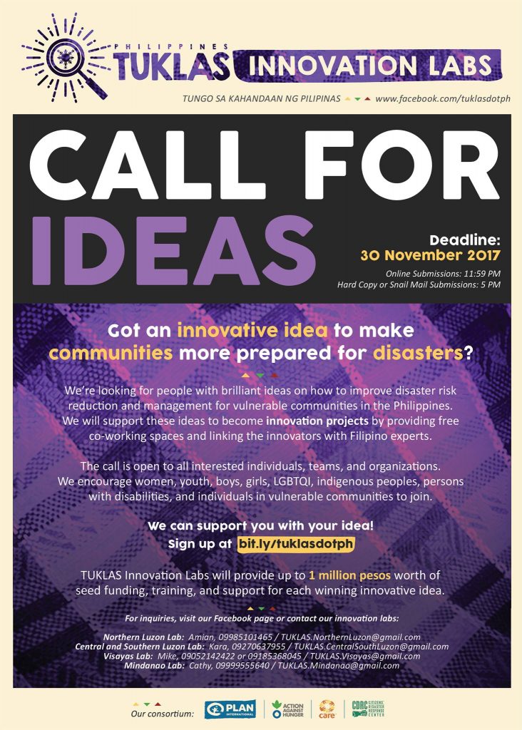 A Consortium of humanitarian organizations composed of CARE, Plan International, Action Against Hunger and Citizens Disaster Response Center is now calling for IDEAS for its TUKLAS Innovation Labs project! Everyone can pitch innovative and inclusive ideas related to disaster preparedness that will benefit poor and vulnerable communities in the Philippines. And when we say everyone, it’s actually EVERYONE. It could be an individual, a team, a social enterprise, a farmers’ association, a women’s group, a team of inspired millenials etc.