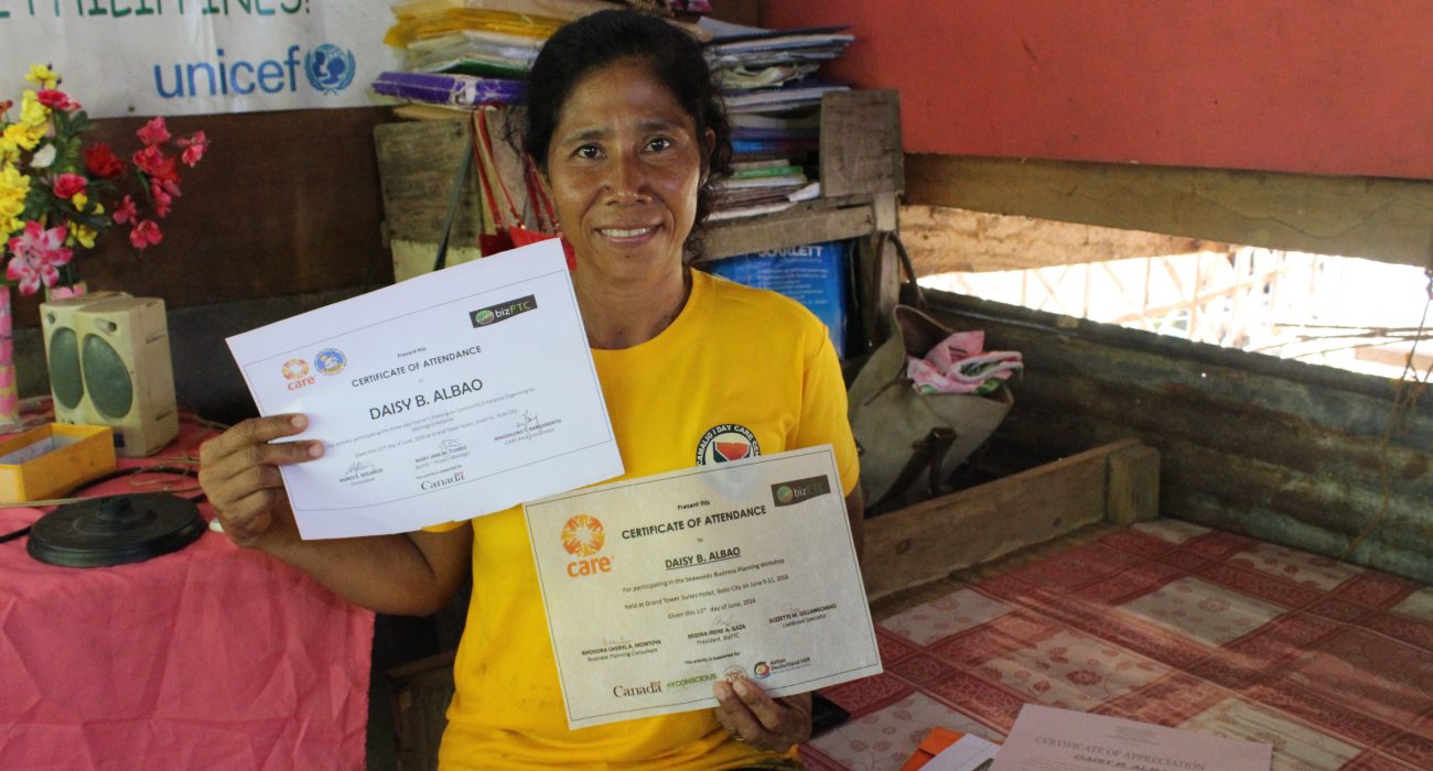AWRIA has also received trainings from CARE and its partner Taytay sa Kauswagan Inc on enterprise management, financial literacy, productivity and marketing. AWRIA’s seaweed production was also badly affected by this year’s El Nino but they continued working to recover.